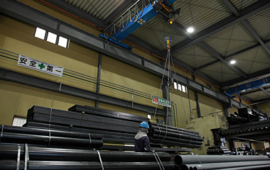 4.8t/2.8t/2t/1tクレーンを、自社工場2箇所に合計12台装備。ラインにおける、定尺材料や大型製品のスムーズな移動を可能にしています。また、2t/1tクレーンにより、中・小型サイズの材料・製品も迅速な搬送が可能。製品に合わせて、フレキシブルなライン編成への対応を実現しています。